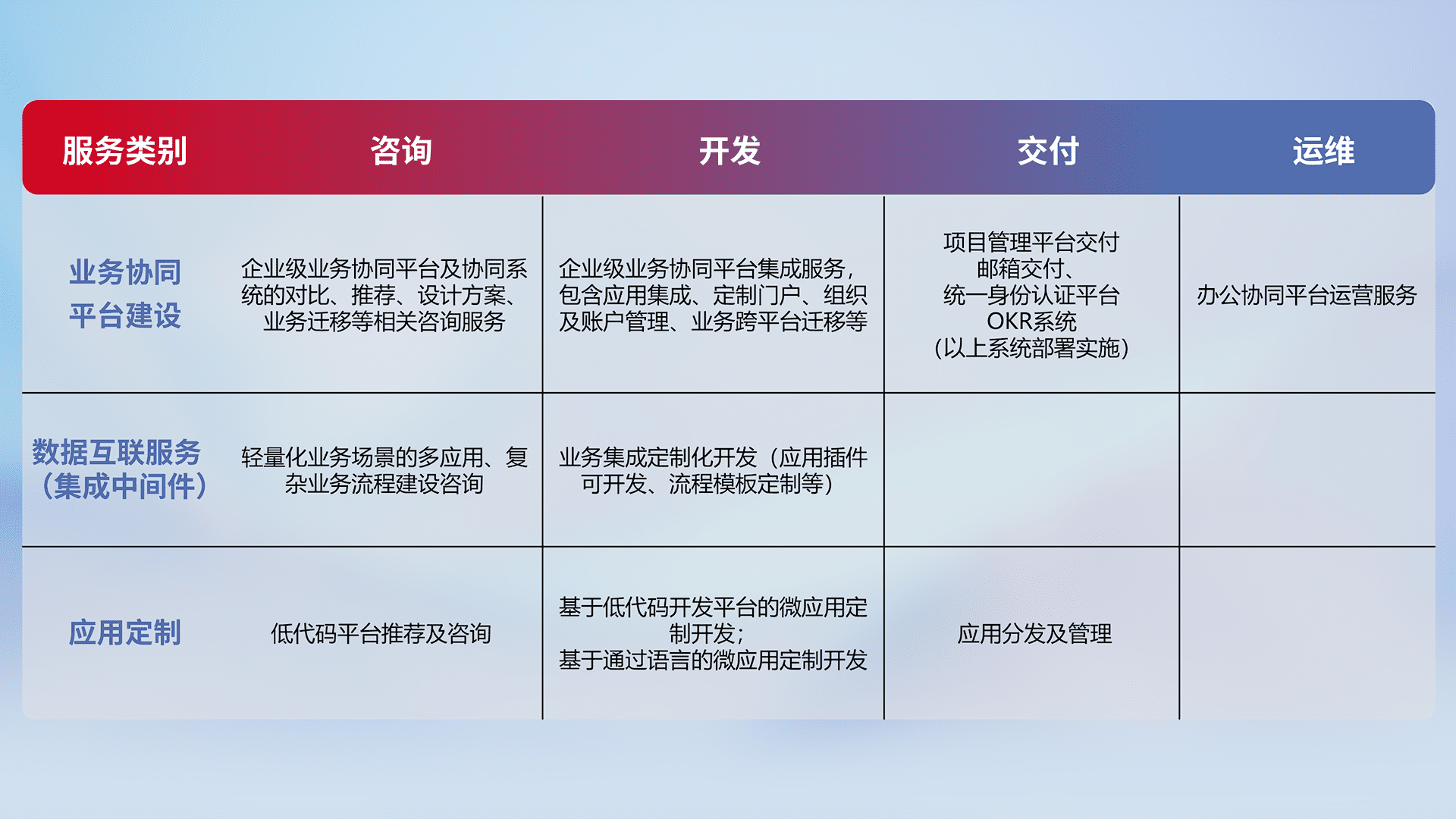 针对钉钉、、企微、、IDaas等平台级产品提供产品的规划、、、、方案、、、交付、、定制化开发等服务,,,实现如统一协同办公、、智能客户服务、、混合会议管理、、、、智能数据查询、、、、等业务场景,,,,实现数字化转型。。。。